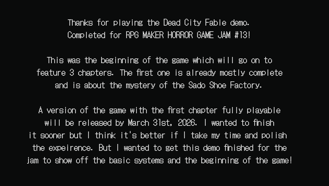 Dead City Fable (デッド・シティ・フェイブル) is a psychological horror RPG set in a depressed, isolated port town on Sado Island, Japan. You play as Yuuma, an autistic 10-year-old boy whose unique perception of the world allows him to see what others ignore: a "glitch" in reality that serves as a social network for the dead.